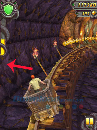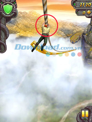 Ngay khi bắt đầu màn chơi, bạn sẽ gặp ngay một chiếc Cliff Hanger (dây treo trên không để đu từ bờ bên này sang phía bên kia). Khi vừa thấy dây treo, hãy vuốt ngón tay lên trên màn hình để bám vào dây, đến cuối dây người chạy sẽ tự động hạ cánh an toàn.