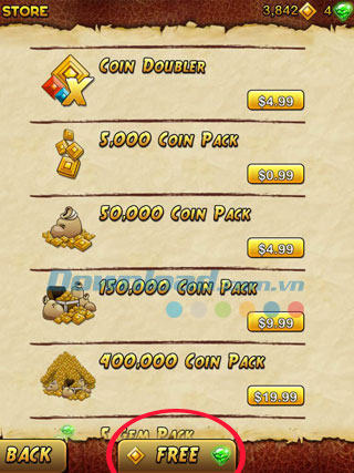Trước khi bắt đầu vòng chạy đầu tiên trong Temple Run 2, bạn nên kiếm vàng miễn phí thông qua một số phương pháp đơn giản. Truy cập cửa hàng Store từ thực đơn chính. Bỏ qua các tùy chọn mất phía phía trên, nhìn xuống dưới màn hình và nhấn Free để kiếm vàng miễn phí: