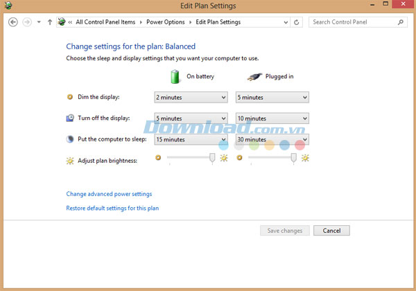 Sau khi vào Power Options, bấm Change Plan Settings. Sau đó, chọn Change advanced power settings. Tiếp đó, truy cập Display rồi nhấn Display Brightness. Kế tiếp, trong phần On Battery hãy gõ tỷ lệ phần mềm độ sáng mà bạn muốn thay đổi. Cuối cùng nhấn Ok.