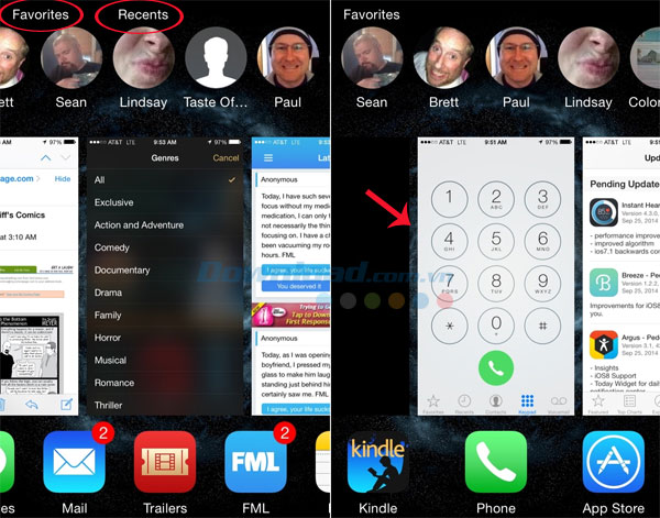 Nhấn đúp vào nút Home (ảo hoặc vật lý) để truy cập màn hình đa nhiệm của thiết bị. Tại đây bạn có thể xem toàn bộ số liên lạc mới nhất ở phía trên cùng màn hình. Vuốt danh sách này sang phải để xem số liên lạc yêu thích. Nhấn biểu tượng số liên lạc bất kỳ để gọi điện, nhắn tin hay liên lạc qua FaceTime.