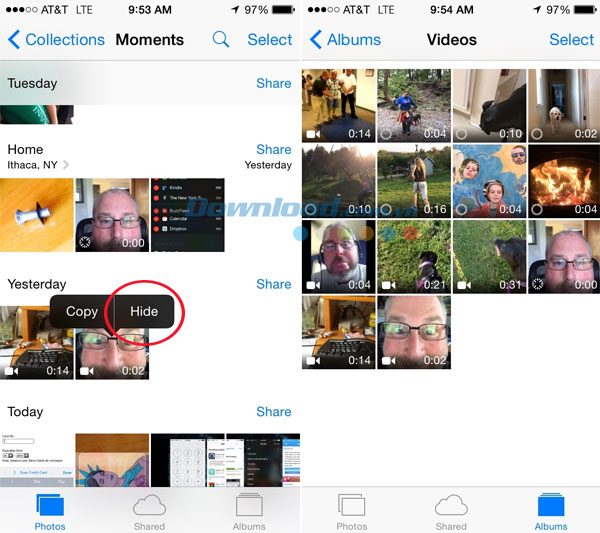 Khi muốn ẩn ảnh hay video không cần thiết hoặc dữ liệu riêng tư trong thư mục Photos, nhấn và giữ vào thumbnail bất kỳ và chọn Hide để ẩn chúng. Ảnh và video sẽ được ẩn tạm thời khỏi giao diện Camera Roll, tuy nhiên bạn vẫn có thể truy cập chúng thông qua nút Albums ở dưới màn hình.