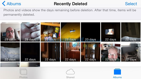 Khi bạn xóa ảnh khỏi thư mục Photos, ảnh chỉ biến mất tạm thời khỏi màn hình nhưng vẫn được lưu trữ trên máy thông qua album mang tên Recently Deleted - tương đương với tính năng thùng rác (Trash/Recycle Bin) trên máy tính cá nhân. Ảnh và video đã xóa sẽ được lưu tại album này 30 ngày trước khi được xóa hẳn khỏi thiết bị. Nhưng nếu bạn muốn ngay lập tức xóa ảnh khỏi máy, hãy truy cập album này, nhấn Select để chọn ảnh và xóa hoàn toàn (hoặc khôi phục lại thư mục Photos).