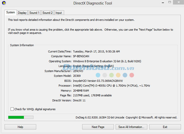 Bước 2: Sau đó, một cửa sổ mới sẽ hiển thị và cho người dùng xem các thông tin liên quan đến các thành phần DirectX và driver được cài đặt trên hệ thống.