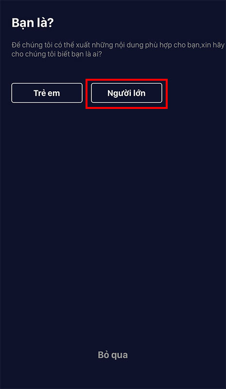 Sau khi cài đặt xong, các bạn mở ứng dụng lên. Ở màn hình hiện ra, nhấn chọn Người lớn.