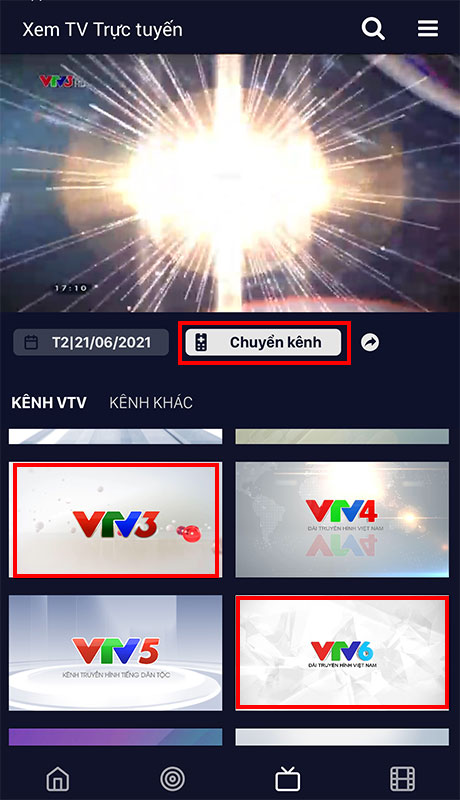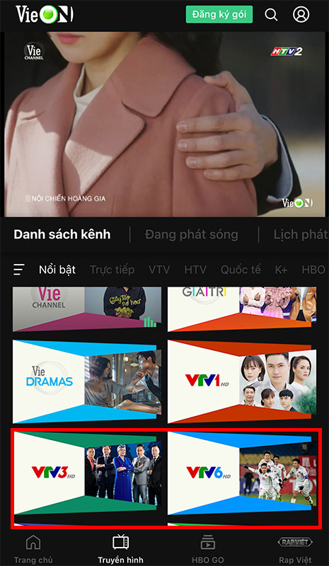 Ở màn hình chính của ứng dụng, chọn tab Truyền hình sau đó chọn kênh VTV3 hoặc VTV6 để xem trực tiếp EURO.