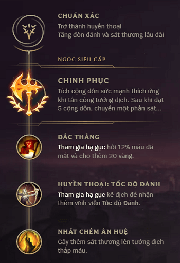 Vừa tăng thêm dame sau mỗi đòn đánh, cho khả năng hồi máu khi đủ cộng dồn, lại gây sát thương chuẩn lên tướng địch. Chinh phục xứng đáng là viên ngọc ở vị trí top 1. Không chỉ hữu dụng với những tướng cận chiến, mà giờ đây, một số xạ thủ thậm chí có thể mang Chinh phục mà vẫn rất mạnh mẽ với lượng máu hồi lại trong giao tranh từ viên ngọc này.