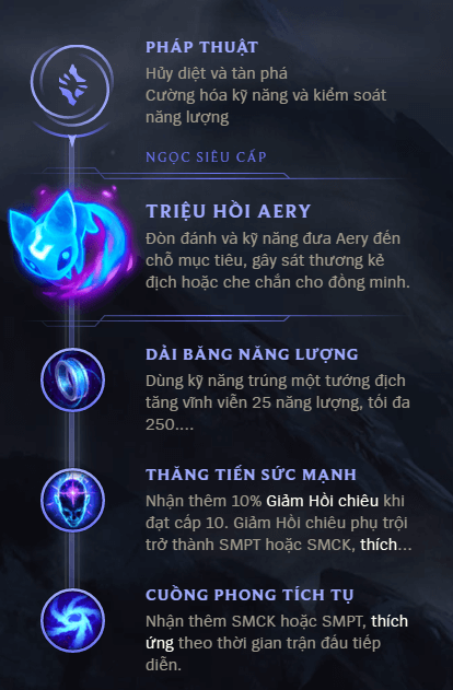 Một viên ngọc đa năng, vừa có khả năng gây sát thương, lại vừa có khả năng hỗ trợ. Triệu hồi Aery cực kì phù hợp với các pháp sư hỗ trợ hoặc đi mid. Đặc biệt đối với một số tướng có khả năng cấu rỉa như Jayce hay Ryze, thì tinh linh nhỏ bé này lại càng phát huy được sức mạnh của mình.