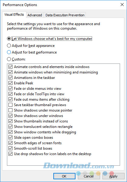 Bước 2: Cửa sổ Performance Options hiện ra: