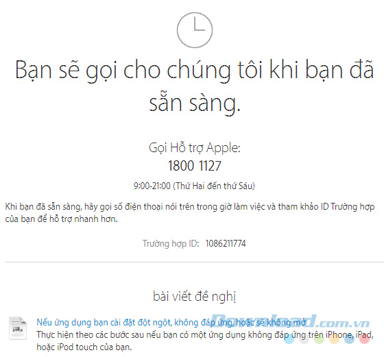 Nói chuyện với hỗ trợ Apple bây giờ: Cung cấp số điện thoại của bạn, chờ một chút, Apple sẽ gọi ngay cho bạn để hỗ trợ. Tuy nói là chờ khoảng 2 phút, nhưng thực tế, thời gian chờ này kéo dài chỉ....10 giây, nghĩa là các nhân viên chăm sóc sẽ gọi cho bạn gần như ngay lập tức.
