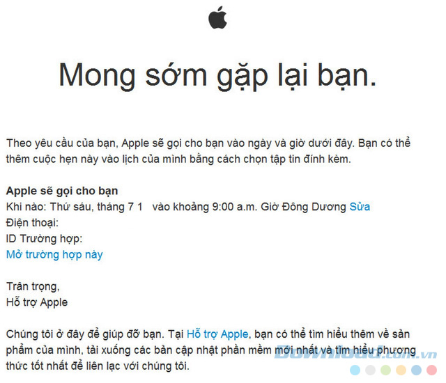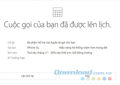 Một thông báo xác nhận "lịch hẹn" về trường hợp của bạn với Apple đã được thực hiện thành công.