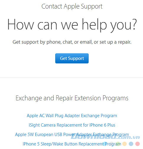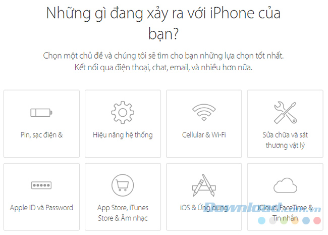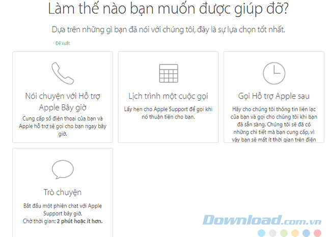 Sau khi thông báo lỗi cho Apple, các bạn sẽ được lựa chọn hình thức mà mình muốn được nhận được sự trợ giúp từ Apple. Hiện giờ, tổng đài tiếng Việt của Apple đang hỗ trợ người dùng Việt Nam dưới bốn hình thức: