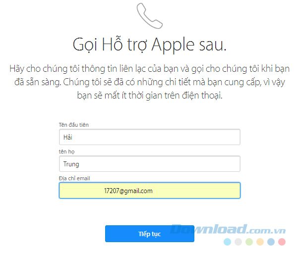 Gọi Apple hỗ trợ sau: Cung cấp thông tin cá nhân để Apple tiếp nhận thông tin của bạn trước, sau đó hãy gọi lại sau khi bạn đã chuẩn bị sẵn sàng.