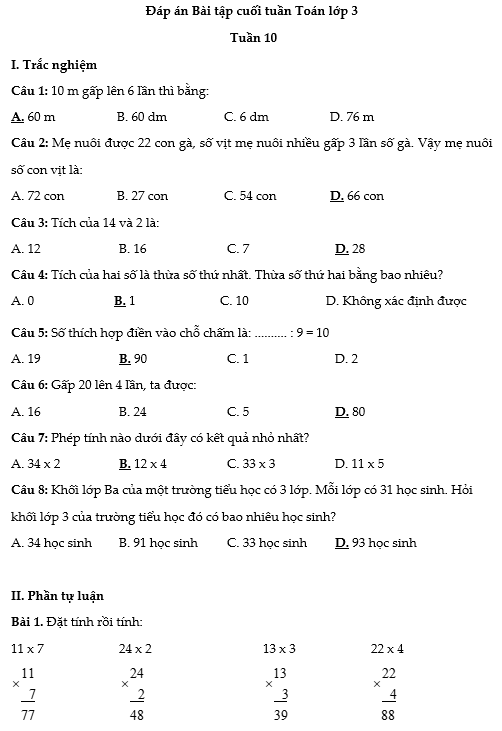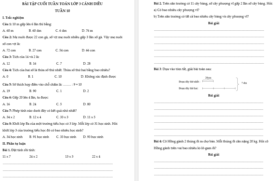 Bài tập cuối tuần lớp 3 môn Toán Cánh Diều - Tuần 10