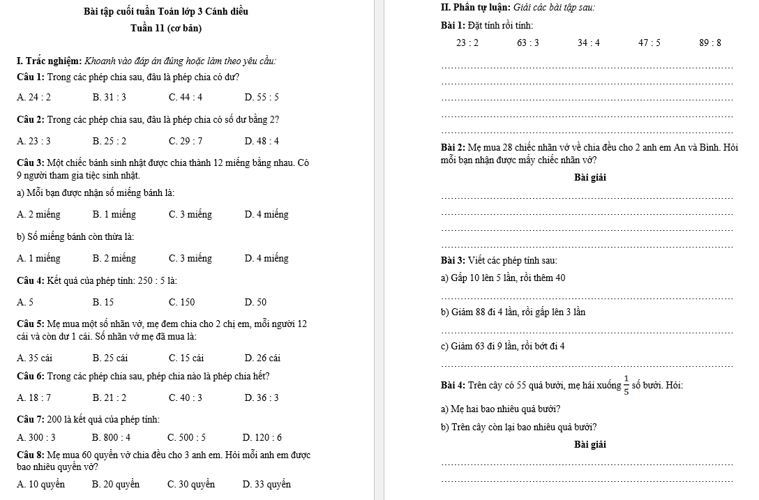 Bài tập cuối tuần lớp 3 môn Toán Cánh Diều - Tuần 11