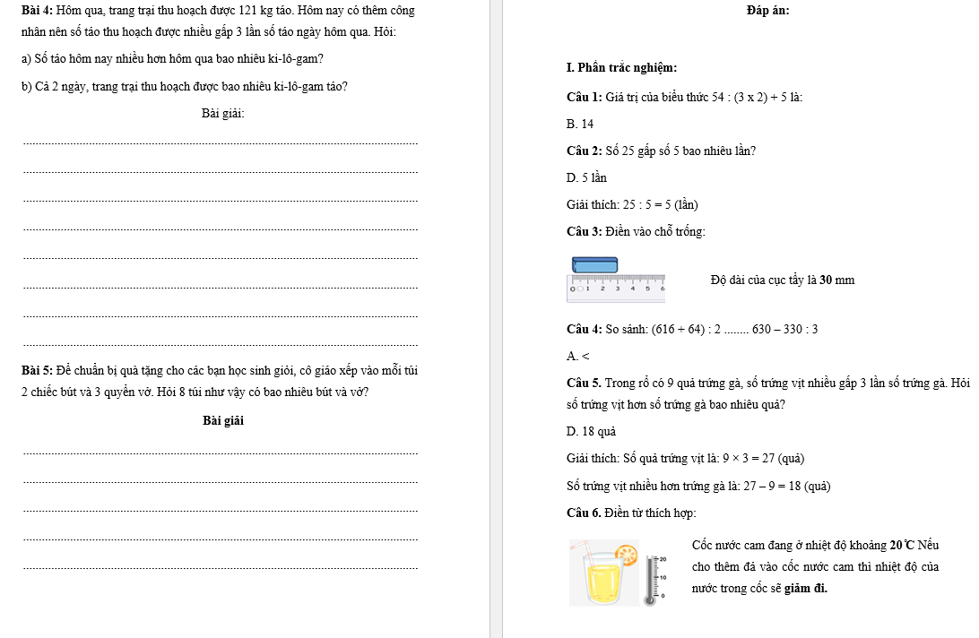 5. Trong rổ có 9 quả trứng gà, số trứng vịt nhiều gấp 3 lần số trứng gà. Hỏi số trứng vịt hơn số trứng gà bao nhiêu quả?