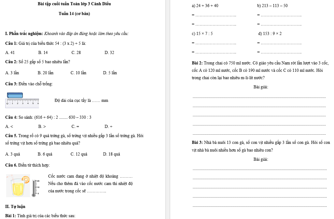 Bài tập cuối tuần lớp 3 môn Toán Cánh Diều - Tuần 14