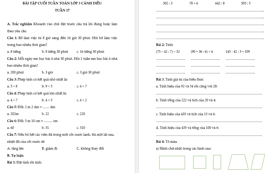 Bài tập cuối tuần lớp 3 môn Toán Cánh Diều - Tuần 17