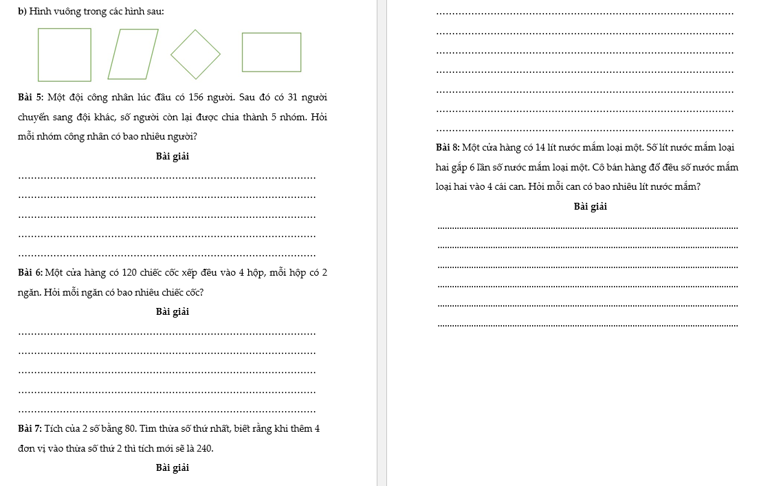 Bài 5: Một đội công nhân lúc đầu có 156 người. Sau đó có 31 người chuyển sang đội khác, số người còn lại được chia thành 5 nhóm. Hỏi mỗi nhóm công nhân có bao nhiêu người?