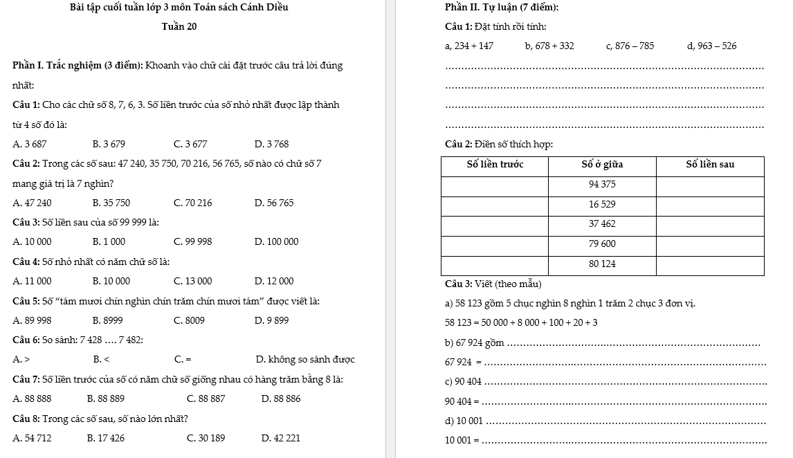 Bài tập cuối tuần lớp 3 môn Toán Cánh Diều - Tuần 20