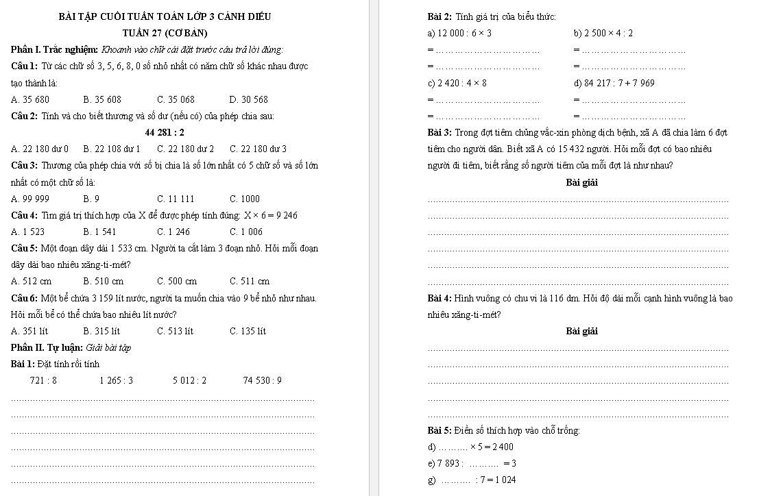 Bài tập cuối tuần lớp 3 môn Toán Cánh Diều - Tuần 27