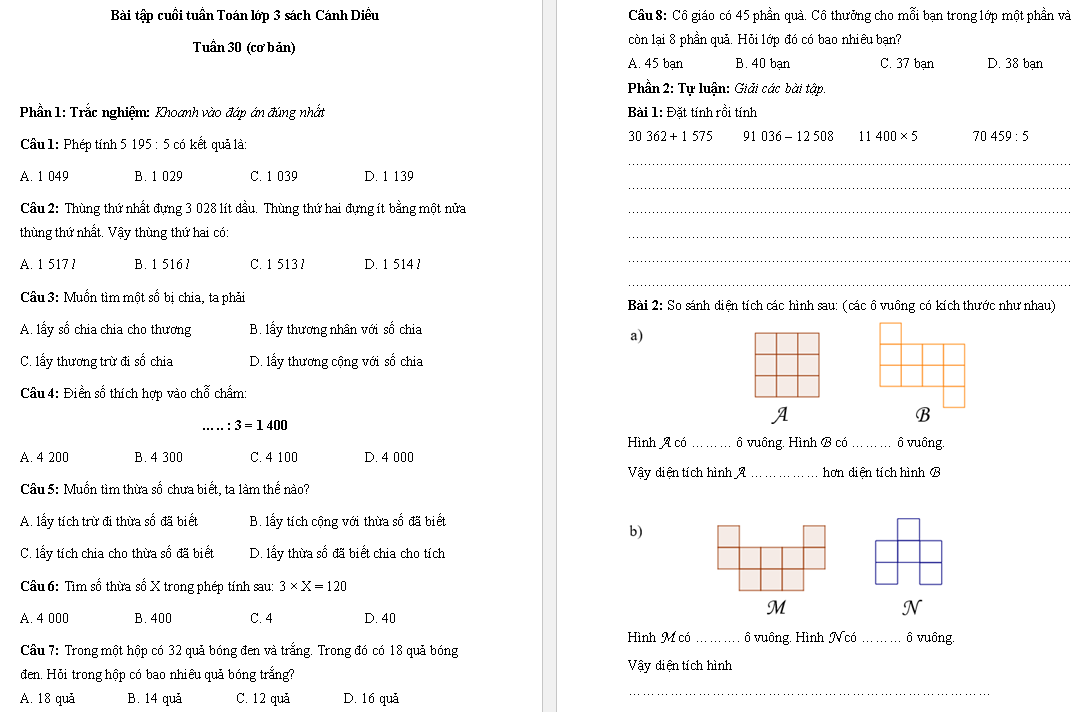 Bài tập cuối tuần lớp 3 môn Toán Cánh Diều - Tuần 30