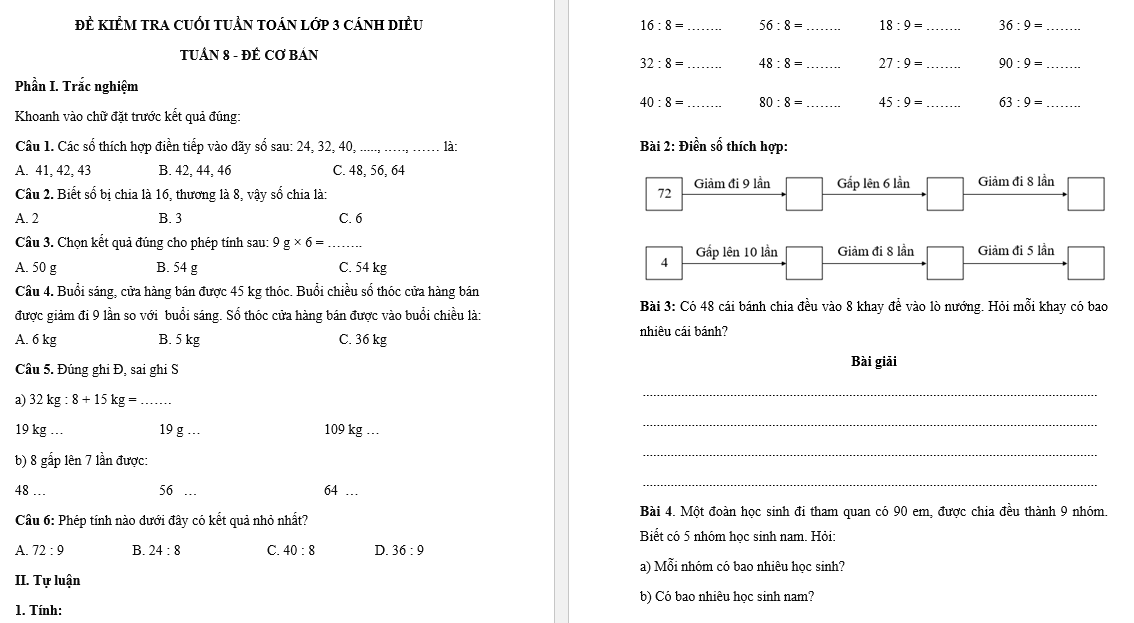 Bài tập cuối tuần lớp 3 môn Toán Cánh Diều - Tuần 8