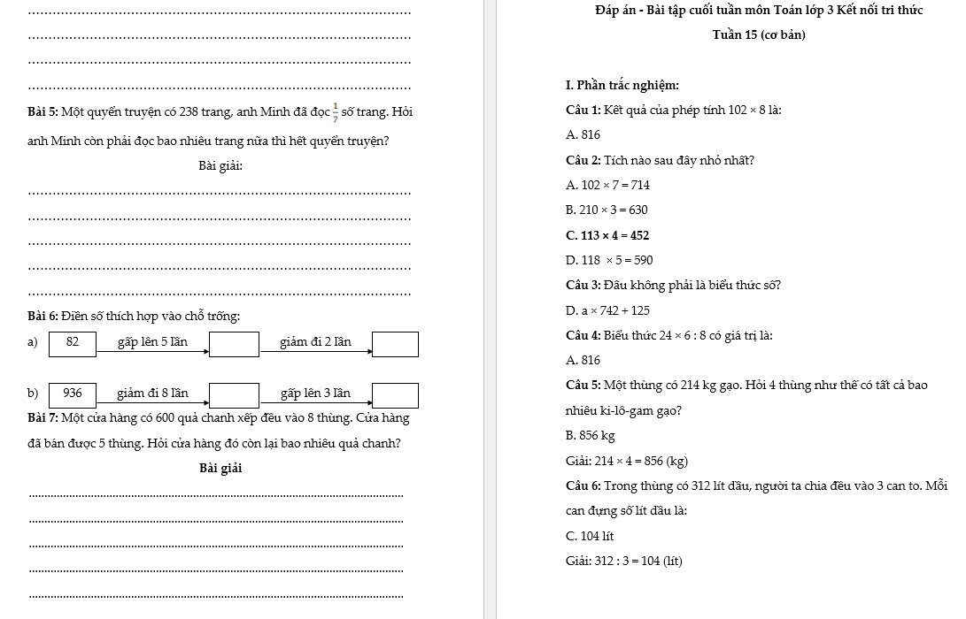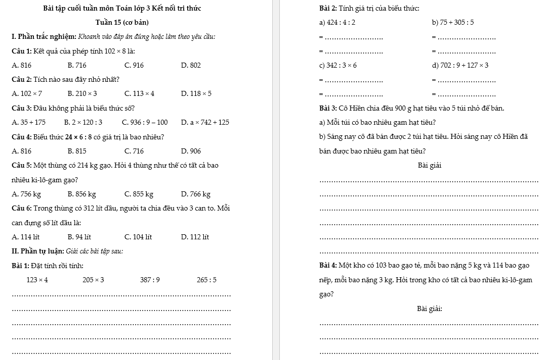 Bài tập cuối tuần lớp 3 môn Toán Kết nối tri thức - Tuần 15
