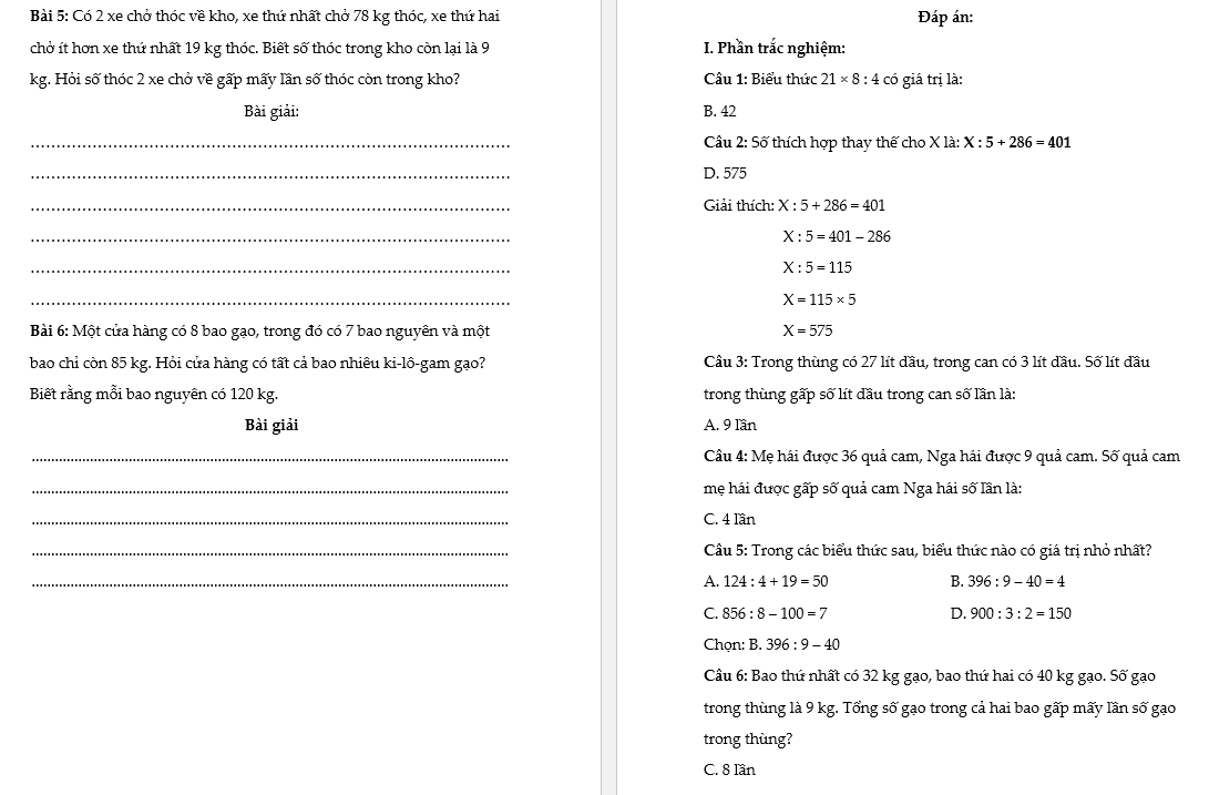 Câu 3: Một xe chở 375kg gạo. Hỏi 3 xe như vậy chở được bao nhiêu ki-lô-gam gạo?