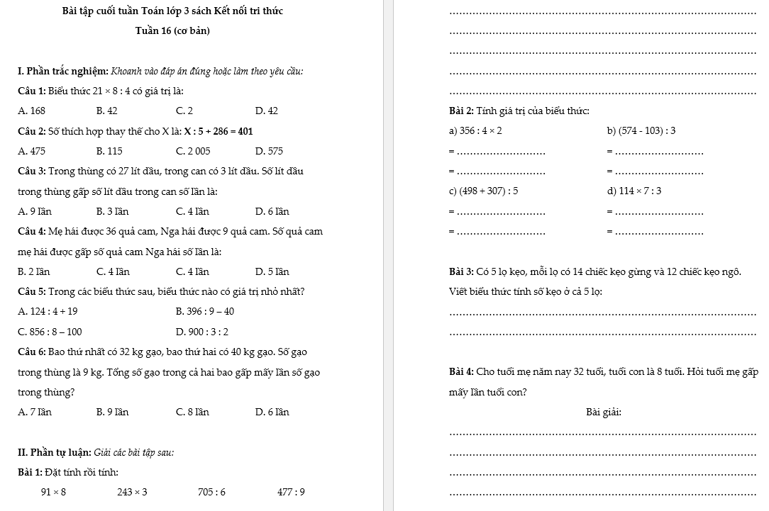 Bài tập cuối tuần lớp 3 môn Toán Kết nối tri thức - Tuần 16