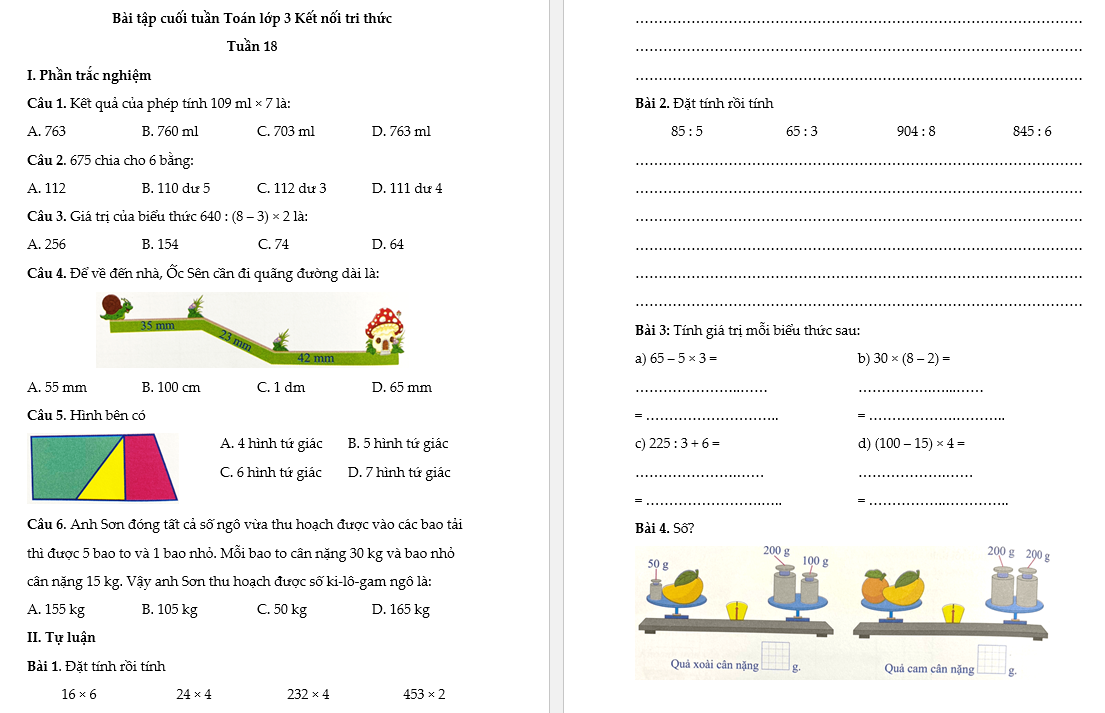 Bài tập cuối tuần lớp 3 môn Toán Kết nối tri thức - Tuần 18