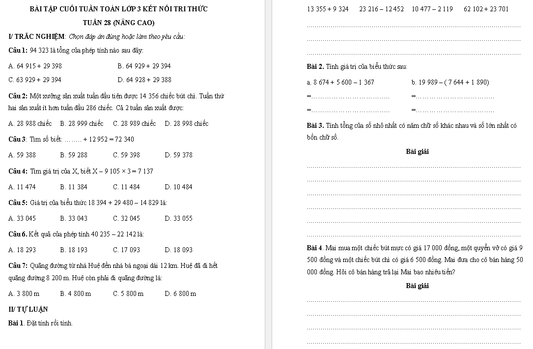 Bài tập cuối tuần lớp 3 môn Toán Kết nối tri thức - Tuần 28