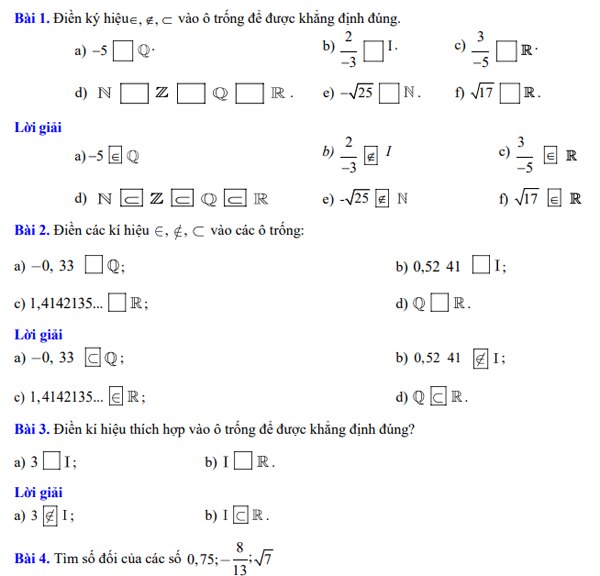 \(\mathbb{N} \subset \mathbb{Z} \subset \mathbb{Q} \subset \mathbb{R} và I \subset \mathbb{R}.\)