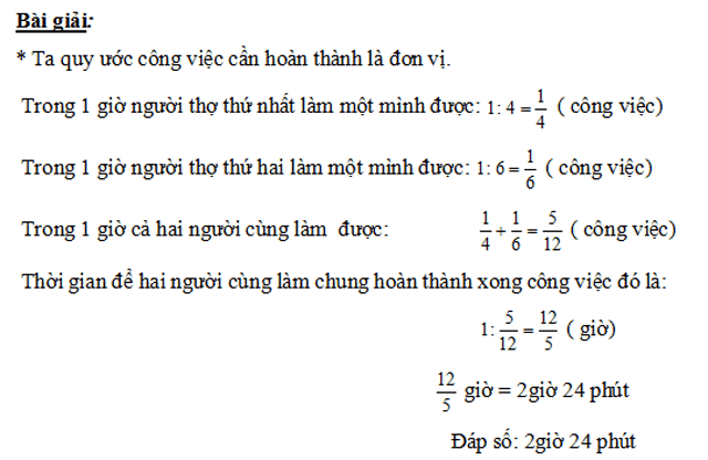 Hai người thợ nhận làm chung một công việc. người thứ nhất làm một mình thì hoàn thành xong công việc trong 4 giờ. Người thợ thứ hai làm một mình thi hoàn thành xong công việc đó trong 6 giờ. Hỏi cả hai người thợ cùng làn chung thì hoàn thành công việc đó mất bao lâu?