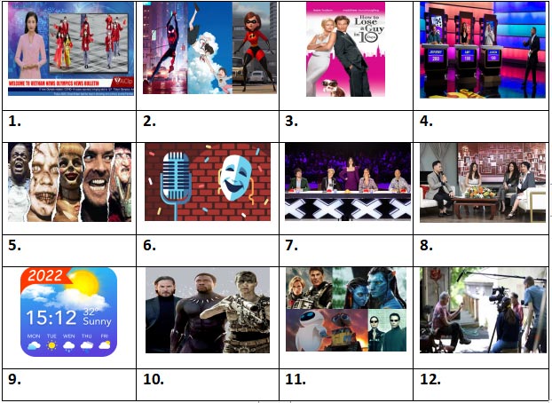 7 - talent show 8 - talk show 9 - weather forecast 10 - action film 11 - science fiction film 12 - documentary |
