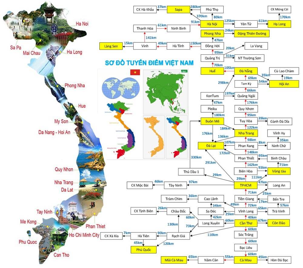 Sơ đồ tuyến điểm Việt Nam là bản đồ các địa điểm du lịch nổi tiếng hàng đầu ở Việt Nam, từ bản đồ này bạn có thể biết được vị trí của những địa điểm du lịch và khoản cách giữa các điểm du lịch với nhau. Đồng thời qua đó giúp bạn có kế hoạch du lịch tại các tỉnh nào vào thời gian nào là hợp lý nhất. Vậy sau đây là Bản đồ tuyến điểm du lịch Việt Nam mới nhất 2022, mời các bạn theo dõi nhé.