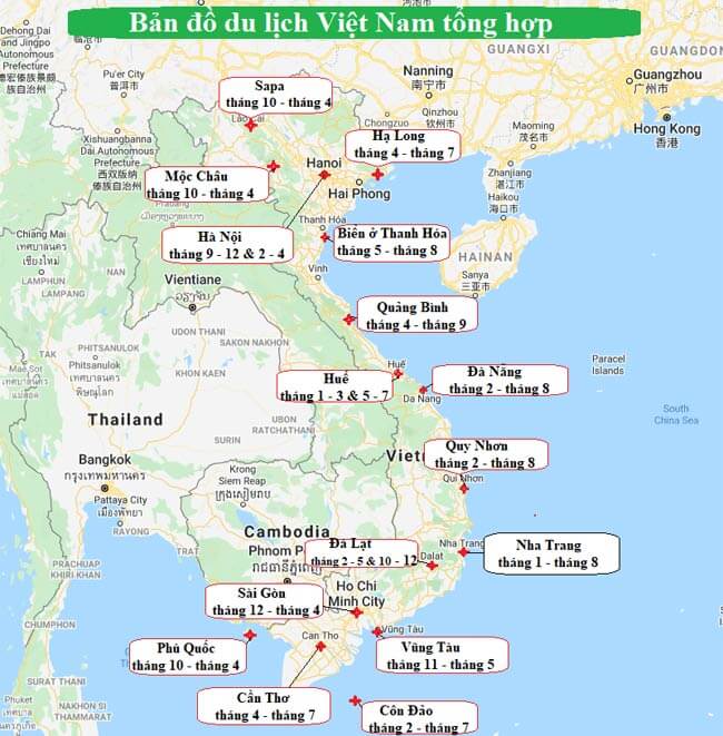 Bản đồ tuyến điểm du lịch Việt Nam theo tháng dưới đây sẽ giúp bạn có kế hoạch du lịch tại các tỉnh nào vào thời gian nào là hợp lý nhất. Đây là những khoảng thời gian trong năm được đánh giá là thích hợp nhất cho du lịch để giúp hành trình du lịch trọn vẹn và tận hưởng được bản sắc vùng miền của từng địa điểm.