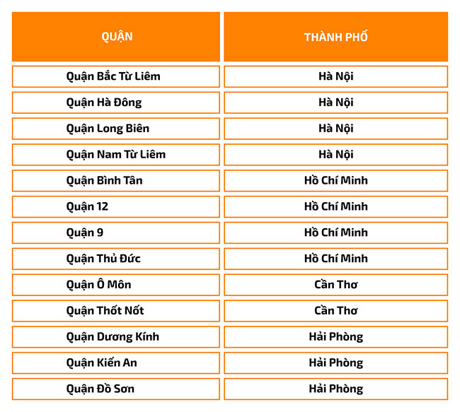 Lưu ý: Dịch vụ tại các Quận Nội Thành sau đây sẽ được tính giá giống như khu vực Huyện/Xã: