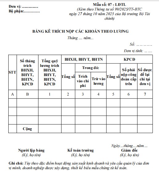 Tìm hiểu thêm »Để đảm bảo tính thống nhất và tuân thủ chặt chẽ các quy định mới về quản lý tài chính - kế toán, Hoatieu.vn giới thiệu Mẫu bảng kê trích nộp các khoản theo lương (Mẫu số: 07 - LĐTL) được cập nhật căn cứ theo Thông tư 99/2025/TT-BTC.