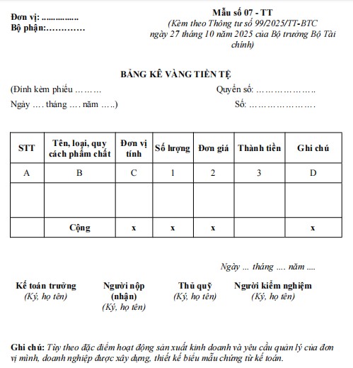 Tìm hiểu thêm »Mẫu số 07 - TT: Bảng kê vàng tiền tệ là chứng từ kế toán bắt buộc được ban hành kèm theo Thông tư 99/2025/TT-BTC, đóng vai trò quan trọng trong việc kiểm soát và minh bạch hóa các giao dịch liên quan đến kim khí quý, đá quý tại đơn vị. Biểu mẫu này được thiết kế nhằm mục đích ghi chép chi tiết các thông tin về số lượng, trọng lượng, quy cách và giá trị của vàng tiền tệ trong quá trình nhập, xuất kho hoặc kiểm kê định kỳ.