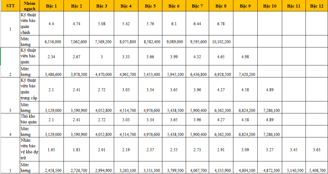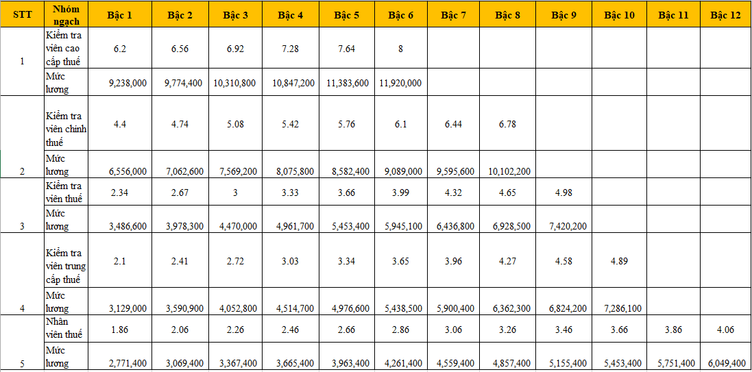 Theo đó, các ngạch công chức chuyên ngành kế toán, thuế, hải quan, dự trữ quy định tại Thông tư 29/2022/TT-BTC được áp dụng Bảng lương chuyên môn nghiệp vụ đối với cán bộ, công chức trong các cơ quan Nhà nước (Bảng 2) ban hành kèm theo Nghị định 204/2004/NĐ-CP. Vậy dưới đây là bảng lương công chức kế toán, thuế, hải quan 2022, mời các bạn cùng theo dõi tại đây.