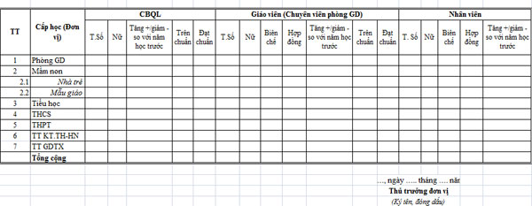 BÁO CÁO THỐNG KÊ TÌNH HÌNH ĐỘI NGŨ CBQL, GIÁO VIÊN, NHÂN VIÊN NĂM HỌC 20....-20....