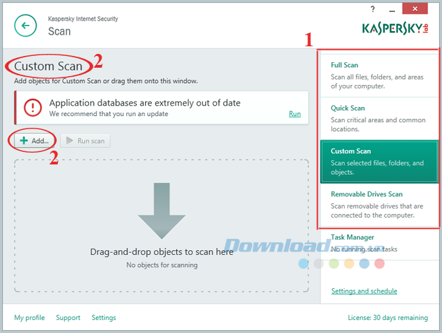 Để có thể quét ổ đĩa bạn hãy chọn vào tùy chọn Custom Scan. Sau đó, nhấn vào Add để chọn ổ đĩa hoặc bạn có thể kéo thả đối tượng cần quét vào khung bên dưới.
