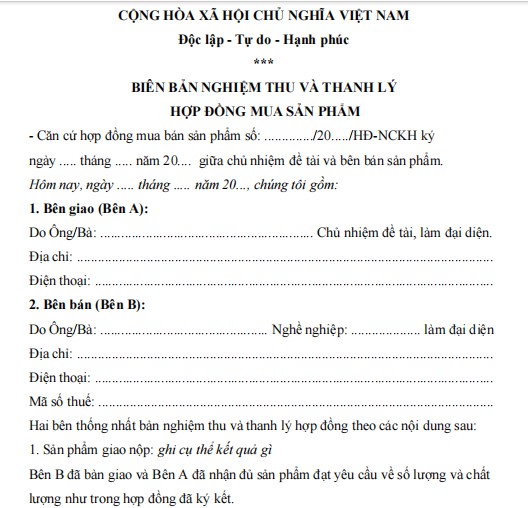 Tìm hiểu thêm »Biên bản nghiệm thu và thanh lý hợp đồng mua sản phẩm dành cho nghiên cứu khoa học tại trường đại học là văn bản pháp lý quan trọng, được lập khi bên cung cấp đã giao đủ hàng hóa, sản phẩm theo đúng điều khoản trong hợp đồng đã ký kết. Biên bản này thể hiện việc các bên cùng kiểm tra, đối chiếu số lượng, chủng loại, quy cách, chất lượng và sự phù hợp của sản phẩm với yêu cầu kỹ thuật của đề tài/đề án nghiên cứu. Sau khi nghiệm thu đạt yêu cầu, biên bản đồng thời xác nhận việc thanh lý hợp đồng, chấm dứt mọi quyền và nghĩa vụ giữa hai bên (trừ các bảo hành, bảo trì nếu có).