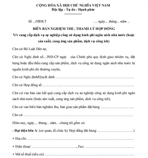 Biên bản thanh lý hợp đồng cung cấp dịch vụ sự nghiệp công dùng ngân sách nhà nước Mẫu nghiệm thu hợp đồng cung cấp dịch vụ sự nghiệp công dùng NSNN