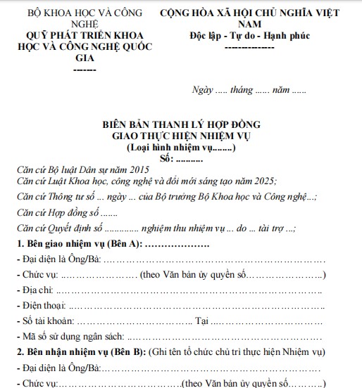 Biên bản thanh lý Hợp đồng giao thực hiện nhiệm vụ khoa học, công nghệ (ban hành kèm theo Thông tư 44/2025/TT-BKHCN) là văn bản hành chính được sử dụng nhằm xác nhận việc hoàn thành, chấm dứt hiệu lực hợp đồng giữa bên giao và bên nhận thực hiện nhiệm vụ khoa học, công nghệ theo quy định của pháp luật hiện hành.