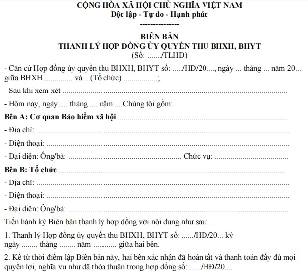 1. Thanh lý Hợp đồng ủy quyền thu BHXH, BHYT số: ....../HĐ/20... ký ngày ........ tháng ........ năm ............ giữa hai bên.
