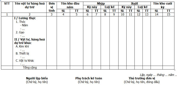 Tìm hiểu thêm »Dưới đây là Mẫu báo cáo nhập xuất tồn kho vật tư hàng hóa dự trữ được ban hành theo Quyết định số 07/2003/QĐ – BTC ngày 17/01/2003 của Bộ Tài Chính.