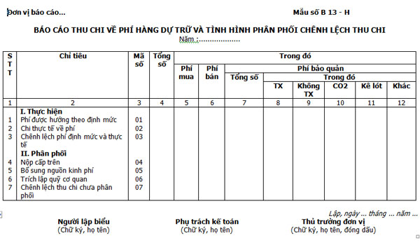 Biểu mẫu Báo cáo thu chi về phí hàng dự trữ và tình hình phân phối chênh lệch thu chi