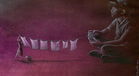 Pawel Kuczynski – nhà họa sĩ nổi tiếng người Ba Lan, được thế giới biết đến với những bức tranh châm biếm, trào phúng thể hiện những mặt xấu xa của thế giới. Ông đã từng nói về các tác phẩm của mình: “Sự hài hước của tôi có màu đen, bởi thực tế phía sau nó là nỗi buồn”. Thực tế phía sau nào được tác giả gợi ra trong bức tranh dưới đây? Hãy viết một bài văn nghị luận trình bày suy nghĩ của anh/ chị về điều đó.