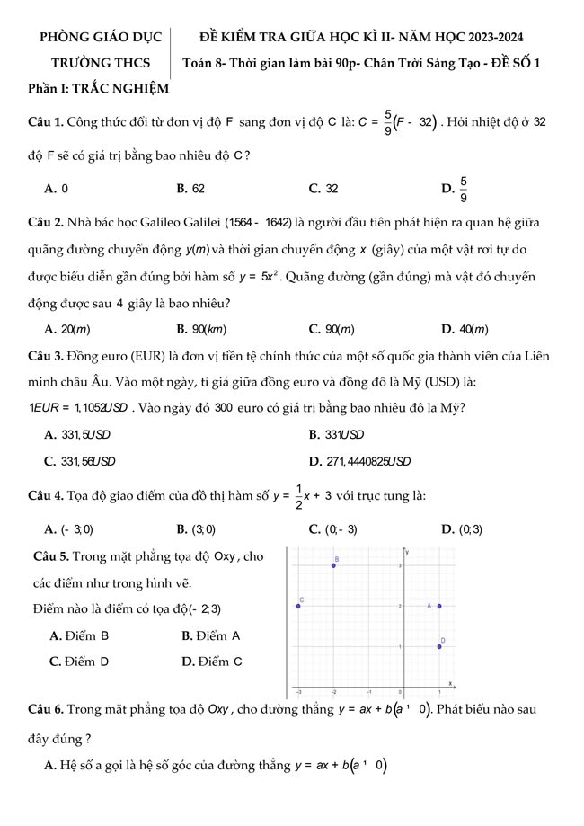 Bộ đề ôn thi giữa học kì 2 Toán 8 sách Chân trời sáng tạo 10 Đề ôn tập giữa kì 2 Toán 8 (Có đáp án)